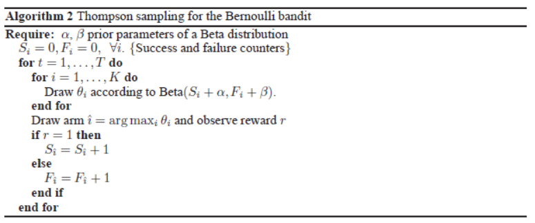 汤普森采样代码实现比较简单,在 Java 中可以基于 math3.distribution.BetaDistribution 包快速实现。在计算广告和推荐领域应用的效果与 UCB(Upper Confidence Bound ,一种基于估计的置信区间设计的E&E优化策略)相比 competitive to or better ,且对于数据延迟反馈、批量数据反馈更 robust 。