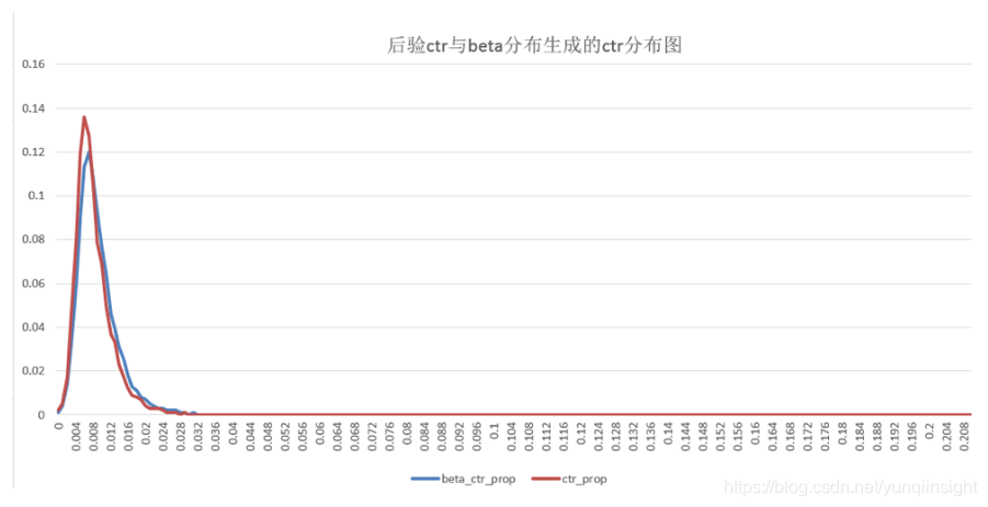 汤普森采样算法的核心在于确定 Beta 分布的参数,以表征后验的 ctr ,如下图所示,为汤普森采样拟合后验 ctr 的分布曲线: