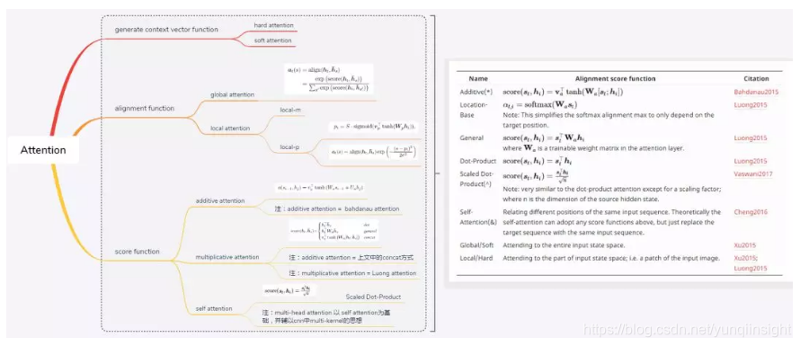 如下图,通常听到的一些 attention,他们的差异其实主要体现在 score-function 层面,其次是体现在 generate context vector function 的层面。我们分别来看看,这些 attention 之间的差异与联系。
