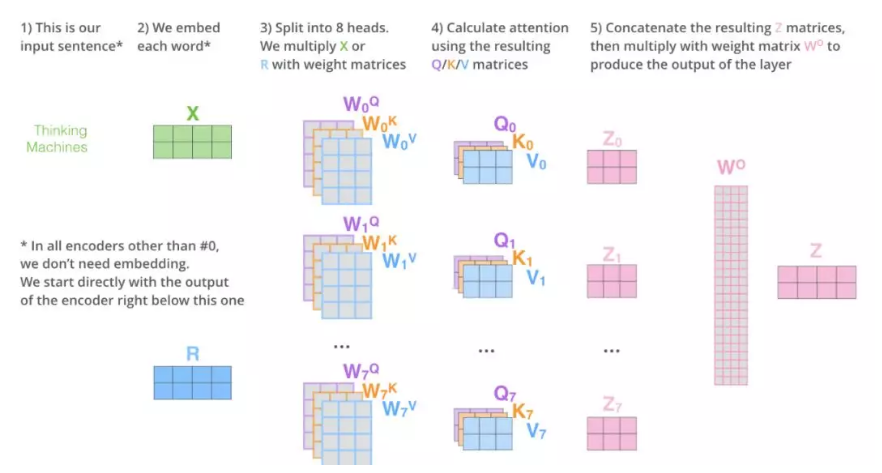 self-attention 借鉴 CNN中 multi-kernel 的思想,进一步进化成为 Multi-Head attention。每一个不同的 head 使用不同的线性变换,学习不同的 relationship。