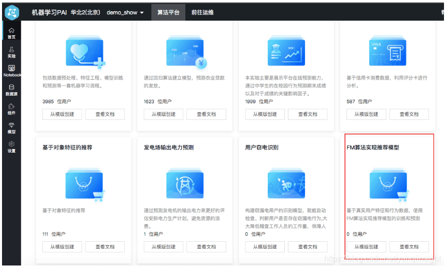 PAI平台的FM算法基于阿里内部大数据的锤炼,具备性能优越、效果突出的特点。具体使用方式可以参见首页模板: