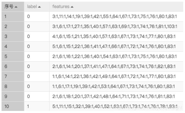 目前PAI的FM算法只支持libsvm格式的数据,数据需要包含两列,分别是特征列和目标列。