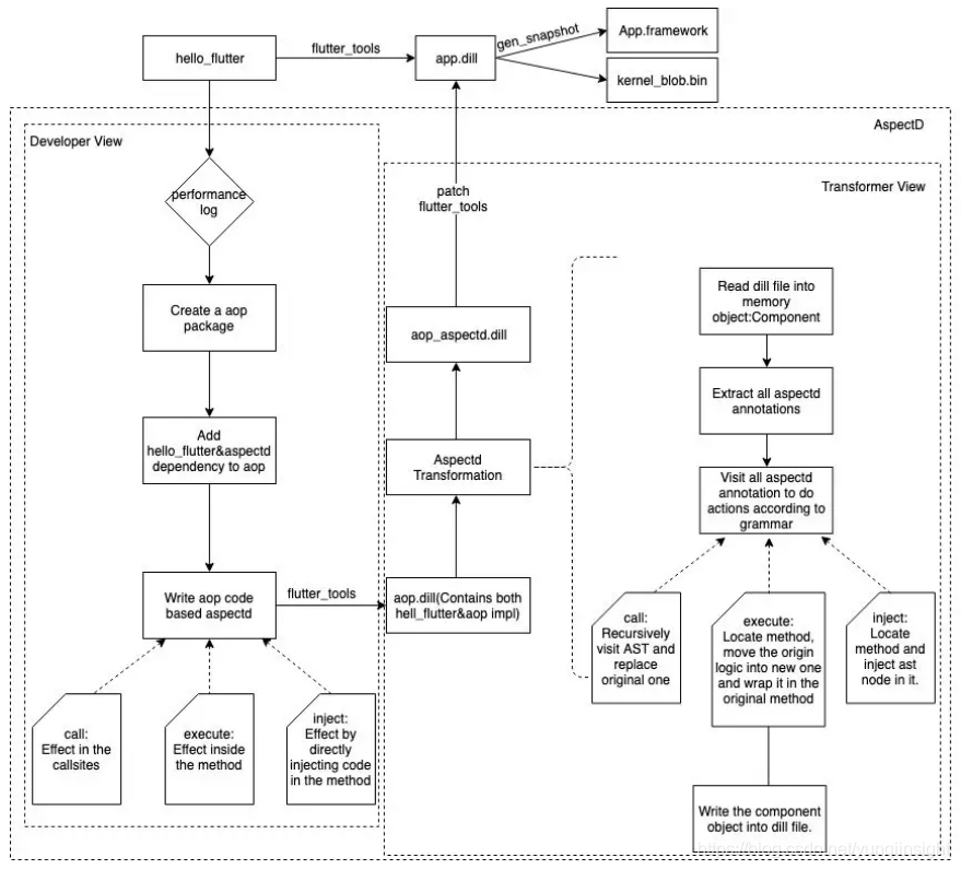 当我们用 AspectD 写出 AOP 代码,透过编译 aop.dart 生成中间产物,使得 dill 中既包含了原始项目代码,也包含了 AOP 代码后,则需要考虑如何对其修改。在 AspectJ 中,修改是通过对 Class 文件进行操作实现的,在 AspectD 中,我们则对 dill 文件进行操作。