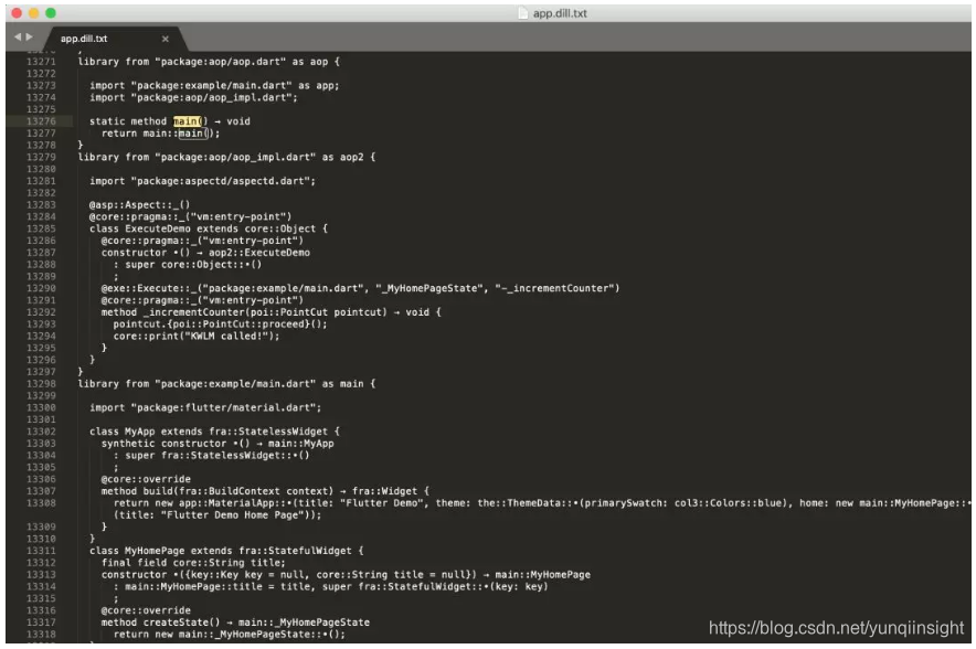 从上文可以看到,aop.dart 引入 import'package:example/main.dart'as app; 这使得编译 aop.dart 时可包含整个 example 工程的所有代码。