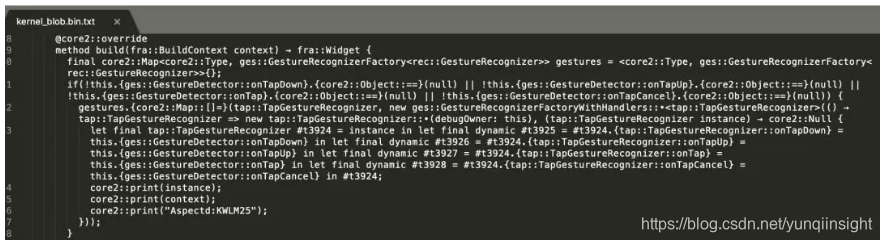 仅支持 Call 和 Execute,对于 Flutter(Dart) 而言显然很是单薄。一方面 Flutter 禁止了反射,退一步讲,即便 Flutter 开启了反射支持,依然很弱,并不能满足需求。举个典型的场景,如果需要注入的 dart 代码里,x.dart 文件的类 y 定义了一个私有方法 m或者成员变量 p,那么在 aop_impl.dart 中是没有办法对其访问的,更不用说多个连续的私有变量属性获得。另一方面,仅仅对方法整体进行操作可能是不够的,我们可能需要在方法的中间插入处理逻辑。为了解决这一问题,AspectD 设计了一种语法 Inject,参见下面的例子:flutter 库中包含了一下这段手势相关代码: