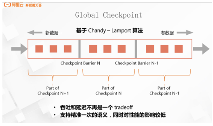 同时为了支持 Exactly Once 的一致性语义,还需要将本地的 State 组装成一个全局的 Checkpoint。Flink 0.9中引入的Global Checkpoint机制是基于经典的Chandy-Lamport算法进行的改进。如图,Flink 会在数据源中定期插入Barrier,框架在看到 Barrier 后会对本地的 State 做一个快照,然后再将 Barrier 往下游发送。我们可以近似的认为处理 Checkpoint 的Barrier只会引出一个消息处理的 overhead,这和正常的消息处理量相比几乎可以忽略不计。在引入 Chandy-Lamport 算法以后,Flink 在保证 Exactly Once 的前提下,提供高吞吐和延迟便不再是一个 tradeoff,可以同时保证高吞吐和低延迟,而其它系统在做类似设计时,往往需要在吞吐和延迟之间做取舍,高一致性会影响吞吐量,反之在大的吞吐下无法保证一致性。