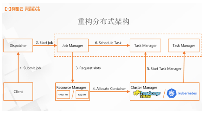 在阿里和社区合作之后,考虑到阿里内部业务数据庞大、线上压力非常大,因此第一个大刀阔斧的改进就是重构分布式架构。早期的Flink在各个角色之间没有清晰的划分,大部分职责集中在同一角色中,比如作业的调度,资源的申请、Task 的分配等内容,并且,这个角色还需要管理集群里的所有作业,在作业量非常大的阿里内部场景,很快就暴露了这样的瓶颈。在重构分布式架构过程中,阿里有意识的将调度作业和申请资源的角色进行分离,设定了Job Manager和Resource Manager两个职责,此后Resource Manager可以完全进行插件化处理,方便对接各种资源调度系统,如YARN和Kubernetes。以对接Kubernetes为例,只需写一个插件,所有的作业便可以顺畅的运营在整个环境中,大大简化了流程。同时,这个架构还支持每一个作业使用独立的 Job Manager 和 Resource Manager,这样也大大提升了扩展性,一个集群可以轻松支持成千上万的作业。