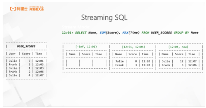 这里需要说明一下 Streaming SQL 的语义,这也是一些刚接触 Streaming SQL 的用户的典型问题。简单来说,Streaming SQL和传统的批处理 SQL 语义上是一致的,只是在执行模式和结果输出方式上有所不同。比如下图是一个用户的分数表,需要做简单的分数求和,同时计算结果的最后更新时间。在 SQL 语句中,SUM(Score) 计算分数,同时取 MAX(Time),与批处理不同之处在于,流式数据的实时性使 Streaming SQL 在运行时无法一下子看到所有数据,如在 12:01 时,Streaming SQL 会数出一个空记录,以为这时候系统连一条记录都没有看到。随着记录源源不断的到来,在12:04时输出第一次的结果,这是对12:04之前记录的数据都进行了计算。在12:07时,可以看到当前表中所有的数据,对结果进行一次更新输出。假设 USER_SCORES 表一开始就存在,那么批处理运行的结果与流计算最终的结果是一样的,这也就说明了流批一体的 SQL 语义的一致性。