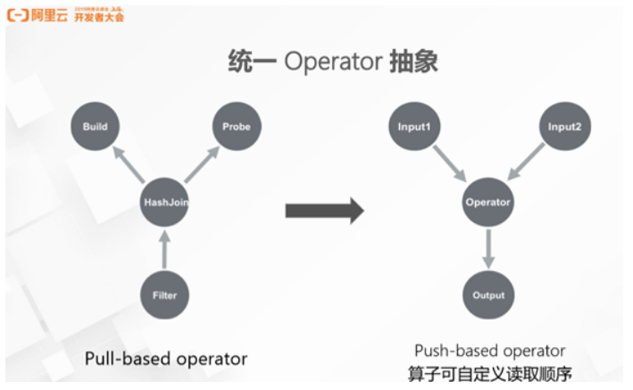 Flink 架构的改动引发了统一 Operator 抽象问题,因为原来的 Operator 抽象只适用于Flink 的 Streaming 作业,Flink 的 DataSet API 并没有使用原来的 Operator 抽象。Flink 早期的代码参考了经典数据库的方式,所有的算子都是以 pull 的模式执行。如下图, Filter 算子尝试找上游拉取数据,上游算子 HashJoin 会尝试往两端(Build 端和 Probe 端)拉取数据,做 Join。在低延迟和高吞吐要求的情况下,Flink 的 Streaming 作业通过推的方式执行,框架在读取到数据之后会以 push 的方式推给所有需要的 Operator。为了统一 Operator 抽象,让 Streaming Operator 也能做到 HashJoin 的操作,阿里在协议上做了扩展,扩展的语义中算子可以通知框架想要的输入顺序。下图中,HashJoin 通知 Framework 优先将 Build 端数据推给自己,在 HashJoin 处理完 Build 端,同时构建好 Hashtable 之后,再把Probe端的数据推给 HashJoin。以往开发人员支持流或批处理时很多算子需要写两套程序,统一 Operator 抽象之后,算子可以实现复用,帮助开发人员提高开发效率,达到事半功倍的效果。