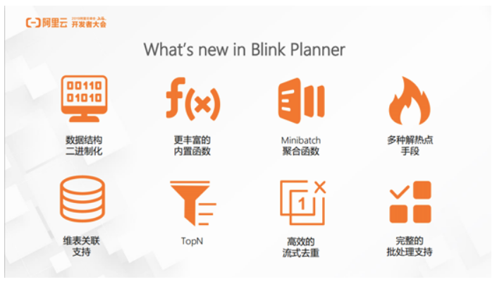 Blink planner 增加了较多的新功能。首先,Blink planner 对数据结构进行了二进制化、增加了更丰富的内置函数、在聚合时引入了 Minibatch 优化、采取多种解热点手段来解决聚合过程中碰到的热点数据等。另外,流计算中的维表关联的应用非常广泛,开发者需要对数据流进行数据量维度的扩增,所以 Blink Planner 也支持了维表关联。TopN 在电商领域应用非常广泛,通过 Blink Planner 提供的 TopN 功能就可以轻松完成统计成交额排名前几的商家这样的功能。在对 TopN 功能进行简单的扩展之后,Blink Planner 还支持了高效的流式去重。值得一提的是,Blink Planner 已经能够完整的支持批处理,目前阿里内部版本已经可以跑通完整的 TPC-H 和 TPC-DS 这样标准的 Benchmark 测试集。