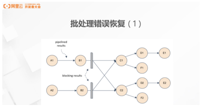 Flink 在 Runtime 层针对批处理实现了较多的优化。批处理中最经典问题便是错误处理的恢复。如下图,Flink 在拓扑中可以比较灵活的调配每个边的传输类型,在 A 跟 B 之间以网络直连,B 跟 C 之间插入 Cache 层,在输出端输出 Cache 数据,减少 FailOver 传播的代价。假设在 D 节点发生了错误,从 D 节点向上回溯到需要重新计算的范围,当回溯到 Cache 层时,如果 B1 的结果已经存在于 DFS 里或者 Cache 到了其它地方,错误的回溯则不需要再继续进行。为了确保一致性,到 Cache 层之后还需继续向下回溯一遍,对下游还未执行或执行一半的作业进行简单的重启,如果没有 Cache 支持,节点之间都是网络连接,当 D 节点发生错误时,错误会蔓延到整张图,而在有 Cache 支持的情况下只需重启其中很小的子图,可以大大提高 Flink 面对错误时的恢复效率。