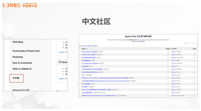 Flink 社区对中文用户非常重视。Flink 社区官网中已经增加了中文版文档的支持。另外,社区开通了 Flink 中文用户邮件列表,用户订阅邮件列表后,可以使用中文描述问题,社区中会有非常多的热心爱好者帮助解答问题。