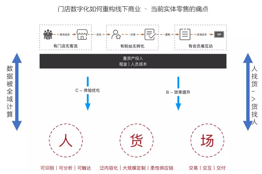 第一,有门店没有客流,线下的客流越来越少。第二,有很多人跑到店里面,也加了会员,但是这些会员如何在后面被更好地经营,更好地转化,传统门店这些粉丝是很难做运营的,当这个消费者离开门店以后,这个店和这个人就断开了连接。第三,有了会员之后,门店导购员如何与会员做一个连接性强的沟通,也是个大问题。可见,线下相比线上而言有大量被等待数字化的商业内容。