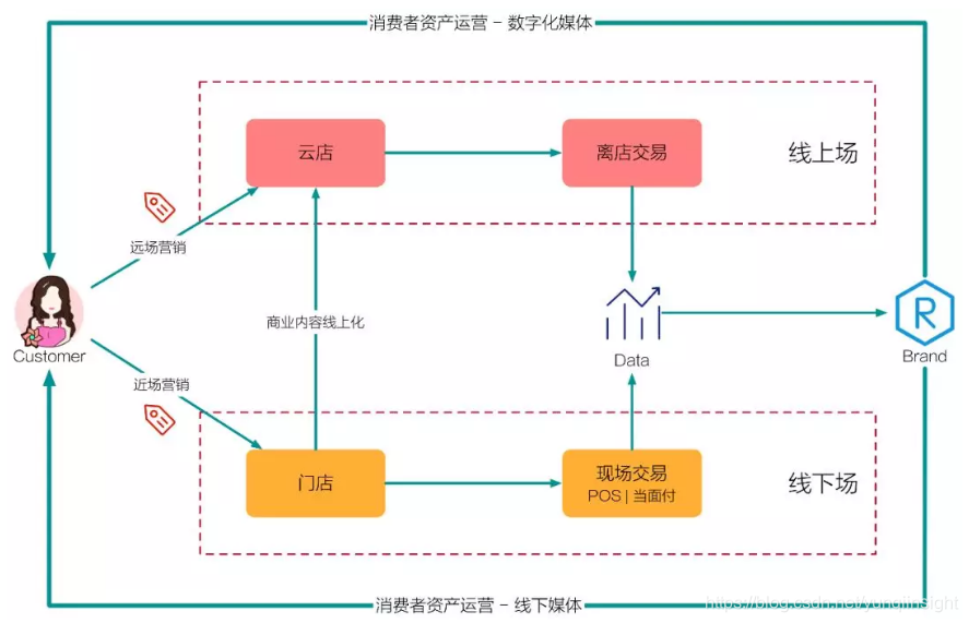 讲了这么多以后,我们可以来看这张相对复杂一些的商业关系图。当你作为一个消费者,其实你是一个物理上的实体,同时也是一个数字化的实体。不管是作为线上客流的一部分,还是线下客流的一部分,通过全域的品牌营销手段,当你是一个数字化实体的时候,你被引导到线上 C 端场,进一步转化到云店,由云店做一个交易的承载场。当你是一个线下的实体,你被营销引导到商圈里一个具体的门店或者是你家附近的一个门店,然后由实体的物理门店对你做一个交易的承载场。而它们两个之间的关系,我刚才也提到了,是一个商业内容的线上化以及数字化镜像的一个关系。