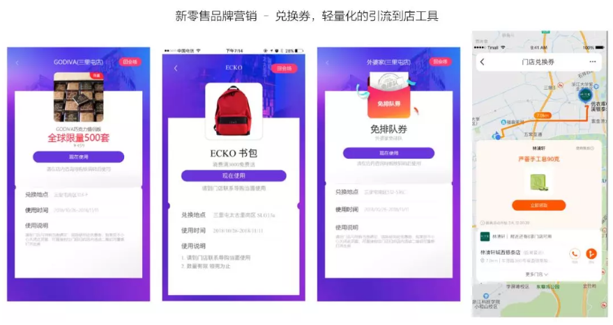 在兑换券多态的基础上,我们也做了LBS属性的一些增强,比如说可以直接用高德导航告诉消费者怎么去往这个门店的路线。对于兑换券来说,为什么它的核销率很高?因为它给一个凭证让你去到店,这个凭证往往是具有非常强的引流属性,比如一个小样的赠品,而一旦通过这个小样让消费者到达门店现场,就有极大的概率会产生二次消费。这也是为什么很多品牌希望消费者能够去门店退货的原因,虽然这次把东西给退了,但是你其实还是会逛一下,有很多被动的信息输入,有可能会产生二次消费,如果是电商的话,寄个快递退就退完了。