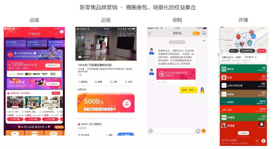 在远场,可以在天猫逛逛去领券包,也可以在高德导航里的目的地的详情页里看到,当我刚好要去某木门品牌的家具店时,可以领一个该家具卖场的券包,去现场消费。同时,在智能导购这个产品上,门店导购也可以主动对他的会员做券包的发放。在 C 端的详情上可以看到,明确告诉消费者这块区域里面,你有这些权益是可以被使用的。