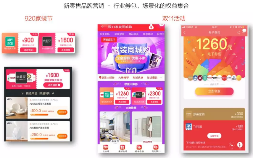 第二种形态是行业券包,我们发现其实有非常多行业存在线下的权益联盟的组织形式。比如家装行业,相信很多人家里搞过装修,你不会只买一扇门,或者只买一个马桶、地板,一定是一个组合方案。家装券包解决的就是将一系列没有利益冲突的品牌权益,通过算法的形式去组织成电子券包,发放给消费者。消费者去到家居广场的时候,很明确知道现在哪些店是搞活动的,是能够享受到这些权益的,有更大的概率去逛这些门店。
