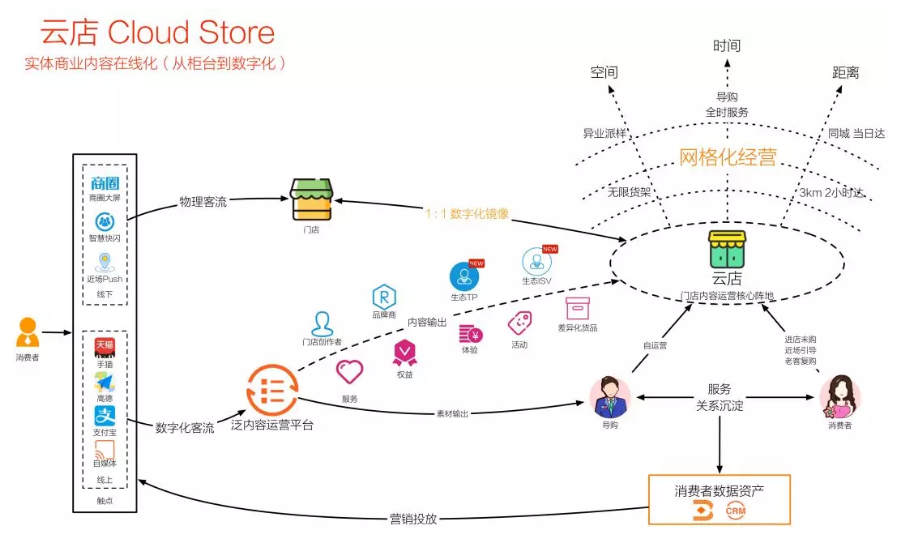 基于此,我区分了过去和现在我们所做的对门店数字化的变化,以前我们更多的给门店做信息化,它有个前提假设:离你最近的门店是最佳服务者。但是云店这种门店数字化方式,哪怕是我人在杭州,但是上海的一家门店也可以为我服务,消费者可以自由的去选择为他服务的门店,背后可能是内容的差异化。