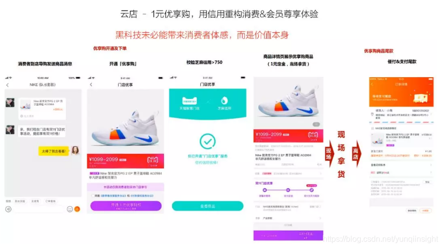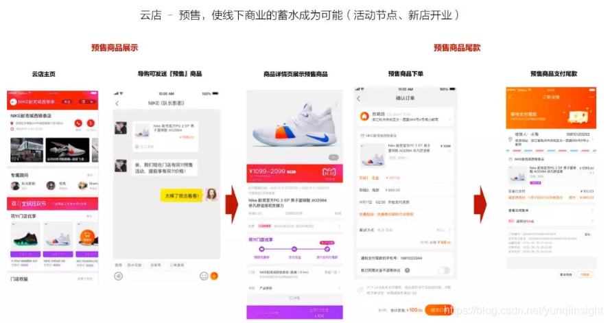 预售的流程:当你进到云店主页可以看到,有商品,有LBS的地理位置的信息,有权益,也可以有一个门店优享的专属模块。在消费者去下单这个预售商品的时候,会看到一个完全符合消费者直觉的一个下单页面,最后给消费者的体验是一个很数字化的体验,但是最后这个东西是从门店履约给你的,有问题也可以直接找门店的人解决。