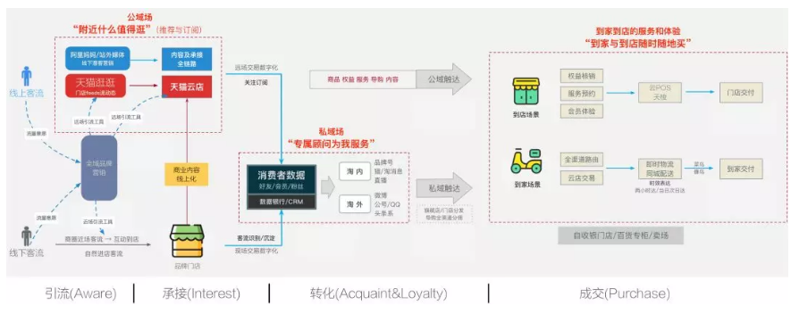 对于线下来说,在总消费者流量的漏斗里面,首先是全域的整个市场的消费者流量,漏下来落到阿里系的流量,再下来漏到近场流量,这个近场可能是一个商圈,可能是一条步行街,再漏下来是消费者进到门店里面成为一个现场流量,最后这个消费者可能会在门店里产生成交。