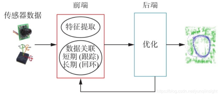 目前主流的视觉惯导融合框架分为两部分:前端和后端。前端提取传感器数据构建模型用于状态估计,后端根据前端提供的数据进行优化,最后输出相机的位置、姿态和全局地图,架构如图所示: