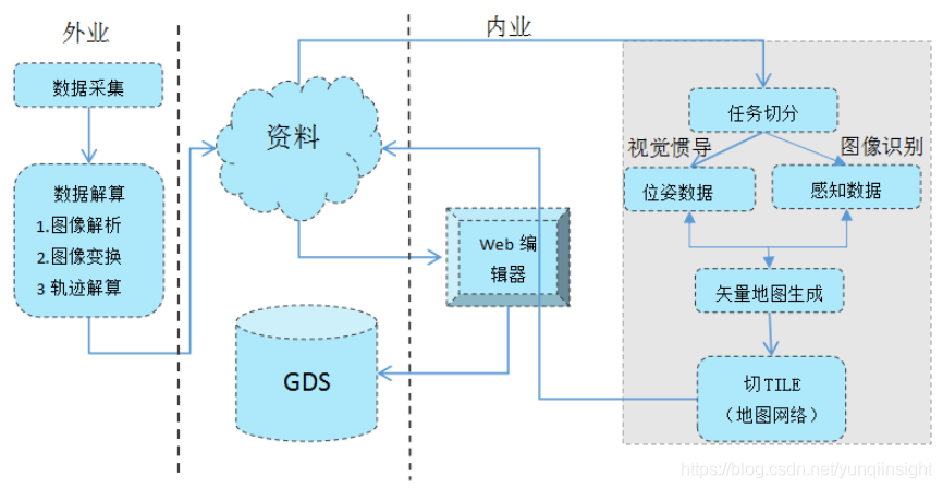 地图要素的生产把人工作业和自动化提取融为一体。首先,通过外业采集的数据进行图像和轨迹的解算,获取自动化所需的视觉惯导信息,根据视觉惯导融合技术生成地图要素,在自动化地图的基础上采用人工进行Web编辑的模型,提高地图要素的精度,最后存储到对应的数据库中去。