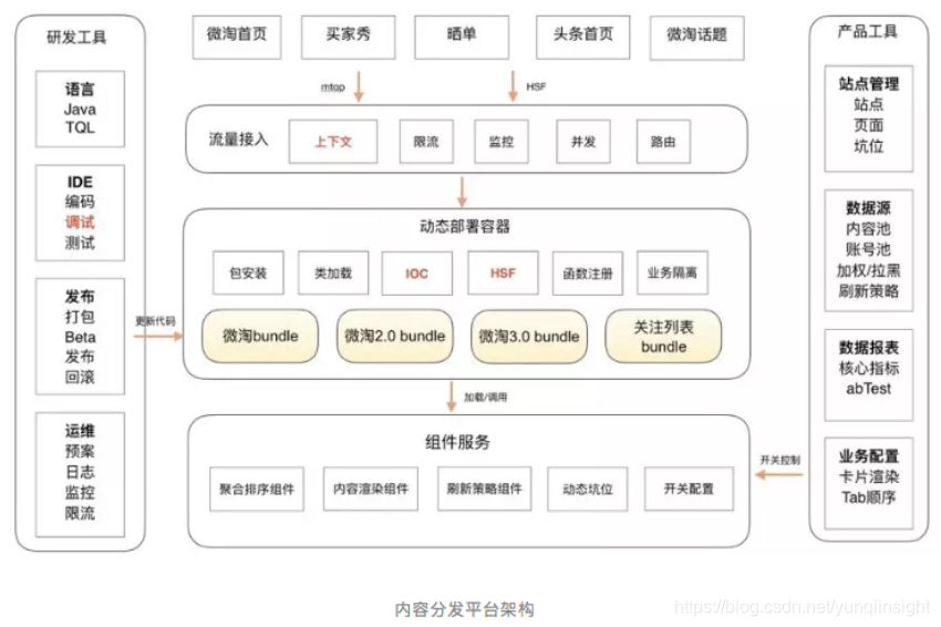 为了解决上述问题,我们把业务代码打包成一个业务 bundle ,做到业务和历史业务隔离,业务和平台隔离,结合内容分发业务现状,集成 AB 、内容、分发策略、社区 API ,整体构建了内容分发平台。