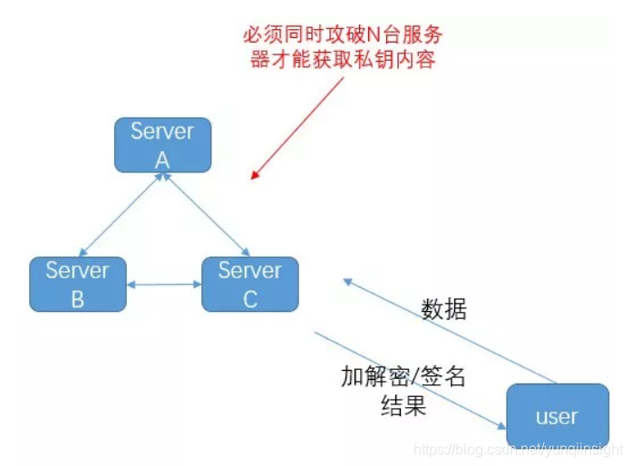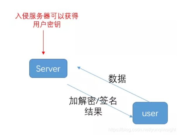 b. 服务器加解密:用户在需要进行加密/签名时,把数据请求发给某个服务器,服务器代为完成加密/签名工作,将加密/签名结果发回用户。
