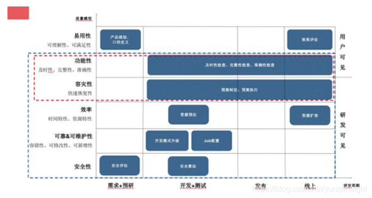 填完内容之后,至于由谁来做就一目了然了。易用性的问题涉及到商业调研、用户需求和产品规划,更多的是 PD 主导的事情。其他几个特性,也就是蓝框中的特性都是开发测试阶段需要考虑的特性。