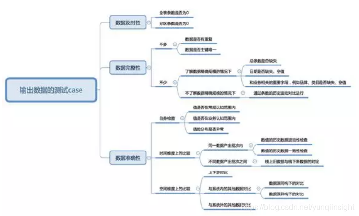 在输出数据的测试方法上,根据功能性下的三个二级特性:及时性、完整性、准确性,对应有不同的测试方法。下面的脑图是一个方法汇总。