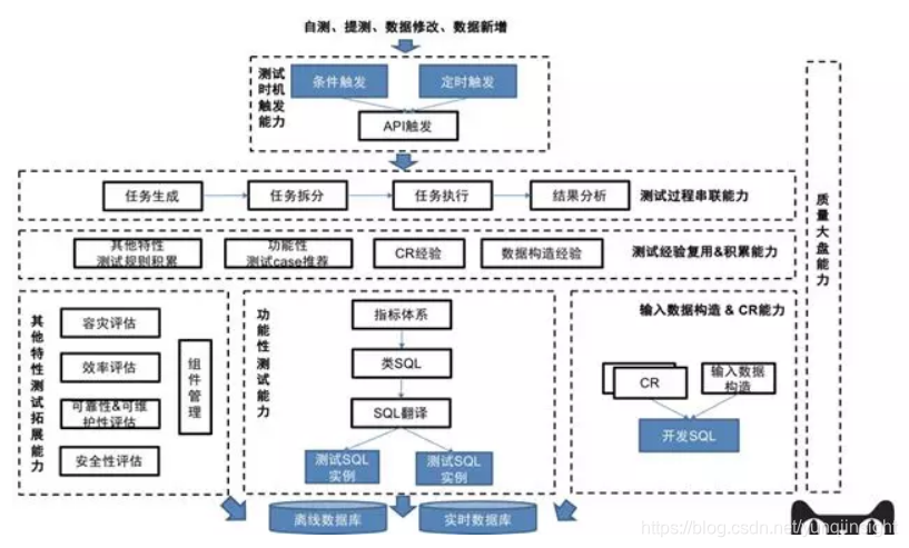 质量大盘能力:质量大盘并不是推导出的需求。但是在以结果导向为主的今天,我们做的事情到底现在是什么样的情况,没有质量大盘数据的支持,往往无法知道。所以质量大盘需要收集测试活动中的数据,包括任务执行成功率、Case 覆盖率、线上新增数据的监控覆盖率等,指导后续数据测试的提升工作。
