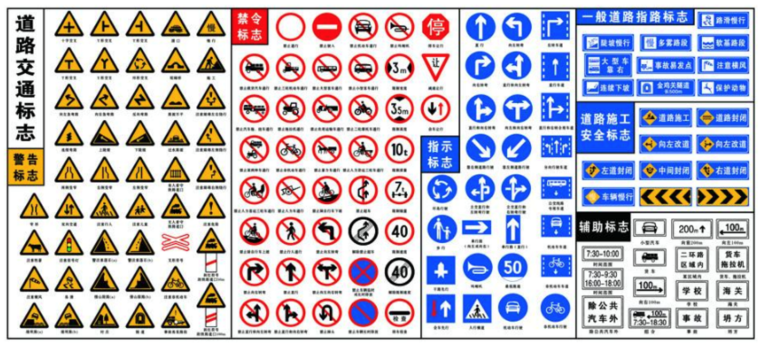 形状多样:常见交通标志的形状有三角形、圆形、方形、菱形、八边形等,还有地面标线、电子眼、信号灯,以及限高杆、栅栏等物理设施;