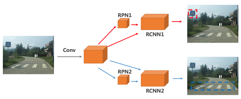 效果方面:将检测目标根据外形特征分为N大类(如圆形、三角形、方形,以及高宽比异常的人行横道等),再为每一类配置专属的RPN网络,各个RPN根据对应的尺寸特性设计Anchor的Ratio和Scale;不同RPN根据需要使用不同层的特征图,设计更有针对性;