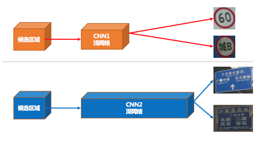 如下图,针对圆形标牌,其差异比较明确,可以使用简单网络;针对方牌,需要根据文字布局和内容来区分正负样本,分类难度大,因此必须使用较深的网络: