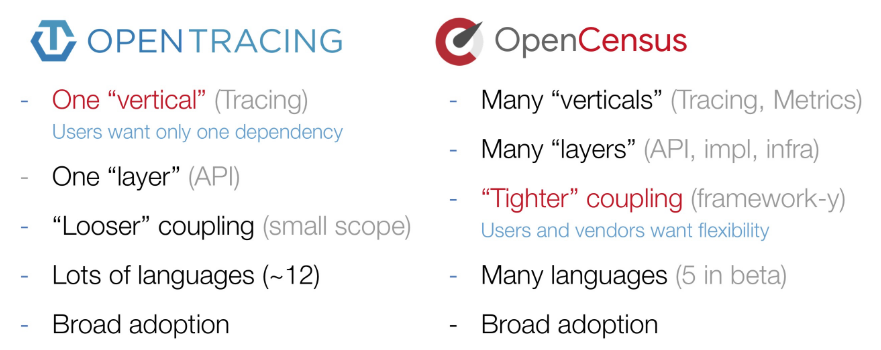大家可能会想,既然有了OpenTracing,OpenCensus又来凑什么热闹?对不起,你要知道OpenCensus的发起者可是谷歌,也就是最早提出Tracing概念的公司,而OpenCensus也就是Google Dapper的社区版。OpenCensus和OpenTracing最大的不同在于除了Tracing外,它还把Metrics也包括进来,这样也可以在OpenCensus上做基础的指标监控;还一点不同是OpenCensus并不是单纯的规范制定,他还把包括数据采集的Agent、Collector一股脑都搞了。OpenCensus也有众多的追随者,最近最大的新闻就是微软也宣布加入,OpenCensus可谓是如虎添翼。