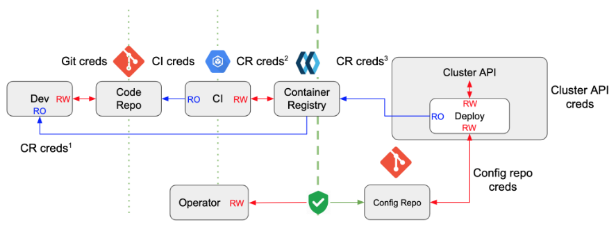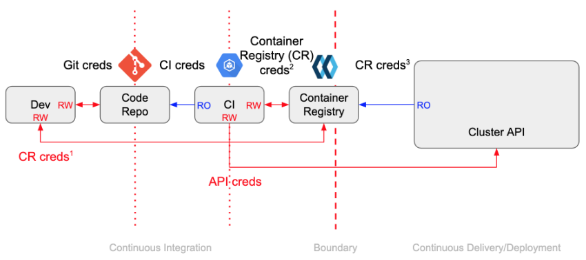 - 跨越安全边界共享秘钥 - 在推模式下,为了让 CI 系统能够自动地部署应用,需要将集群的访问秘钥共享给它。虽然可以通过一些措施进行防护,但毕竟还是将秘钥暴露在了可信度较低的安全上下文中。这种做法扩大了攻击面,会给系统带来潜在的安全风险。