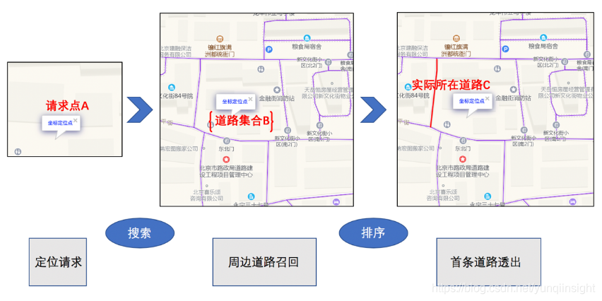 iii.对备选道路进行排序,最终排在首条的备选道路为模型输出结果,即用户实际所在道路C。