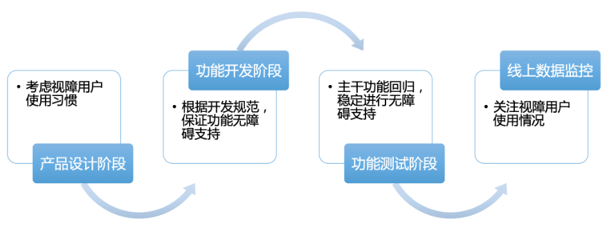 - 产品测试阶段:验证开发优化效果,同时提供给无障碍专业测试团队进行测试;