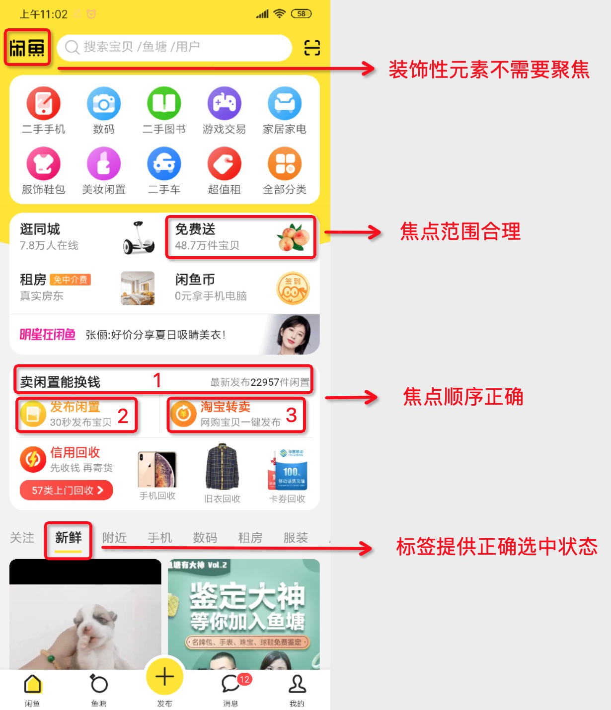 以闲鱼首页为例,装饰性元素“闲鱼”不需要独立焦点;可交互元素“二手手机”均可以被聚焦;左右滑动屏幕顺序正确,可以正常获得焦点;聚焦后元素信息描述正确;聚焦范围合理;标签“新鲜”、“关注”具有正确选中状态,焦点排序正确。