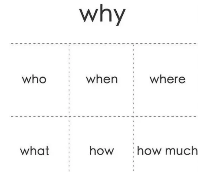 套路是指我们解决问题的方法论,这个也非常重要。比如,5W2H 分析法就是一个非常好的,可以帮助我们分析问题的一个”套路”。试想一下,面对任何一个问题,你都能从 Why、Who、When、Where、What、How 和 How much(如下图所示),七个方面去思考。是不是比不知道这个方法论的人,用点状的思考,5W2H 分析法就全面得多。