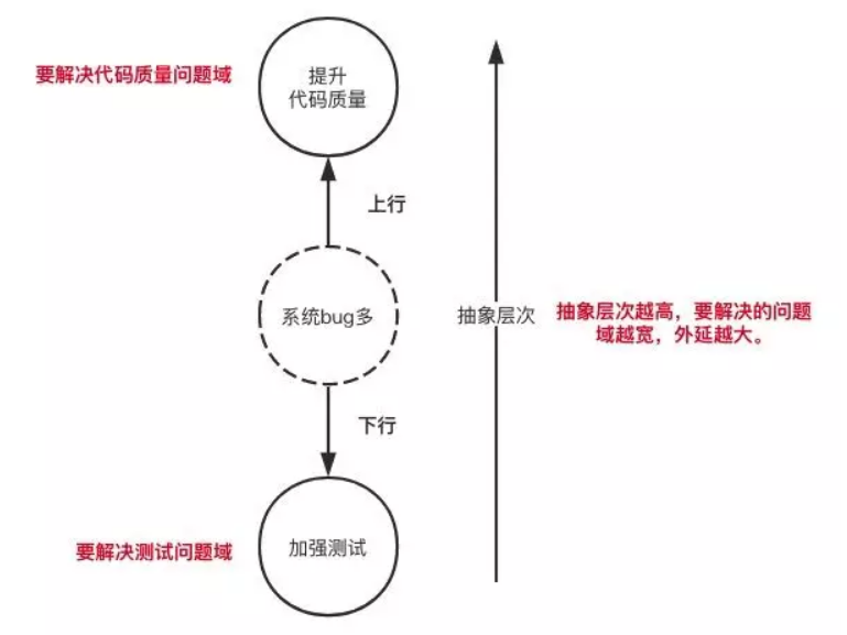 比如面对“系统 bug 多”的问题,向上抽象是“提升代码质量”,向下抽象是“加强测试”,都可以作为中心,选择哪个为中心取决于你当前要解决的问题是什么。