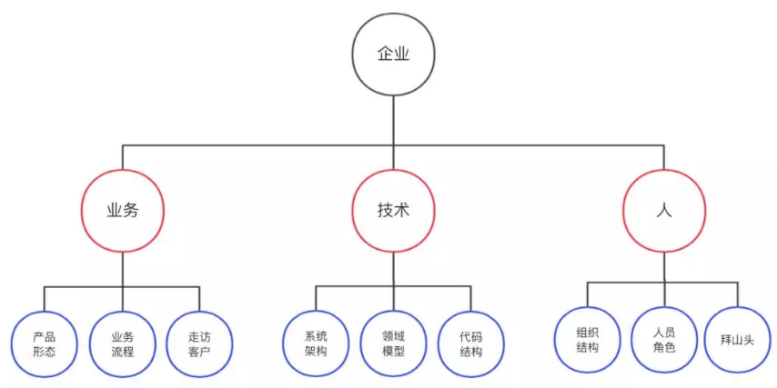 这里,我们就能用上结构化思维来帮我们理清思路,从而有条不紊的开展工作了。我们要知道对一个企业来说,核心要素无外乎就是业务、技术和人,也就是说这三个要素是我们要建立的中心。基于这个中心,我们可以进行进一步拆解,形成子结构。然后对子结构再进行分析找到应对策略。这样一步步递进,我们就已经在用结构化思维解决如何落地新团队的问题了。