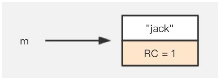 先创建一个字符串,这时候"jack"有一个引用,就是 m。