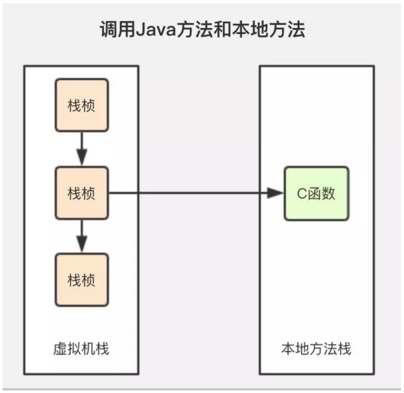 任何 native 接口都会使用某种本地方法栈,实现的本地方法接口是使用 C 连接模型的话,那么它的本地方法栈就是 C 栈。当线程调用 Java 方法时,虚拟机会创建一个新的栈帧并压入 Java 栈。然而当它调用的是本地方法时,虚拟机会保持 Java 栈不变,不再在线程的 Java 栈中压入新的帧,虚拟机只是简单地动态连接并直接调用指定的本地方法。