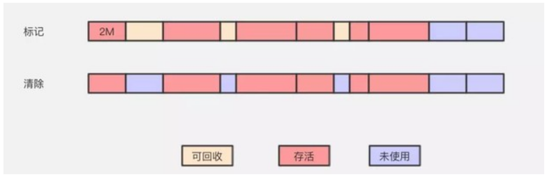 上图中等方块的假设是 2M,小一些的是 1M,大一些的是 4M。等我们回收完,内存就会切成了很多段。我们知道开辟内存空间时,需要的是连续的内存区域,这时候我们需要一个 2M的内存区域,其中有2个 1M 是没法用的。这样就导致,其实我们本身还有这么多的内存的,但却用不了。