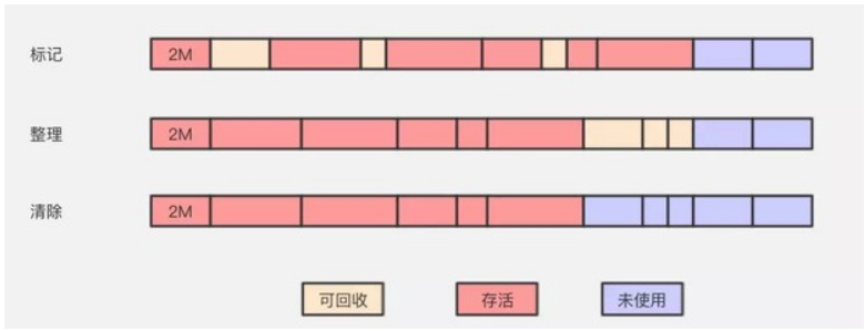 标记整理算法(Mark-Compact)标记过程仍然与标记 --- 清除算法一样,但后续步骤不是直接对可回收对象进行清理,而是让所有存活的对象都向一端移动,再清理掉端边界以外的内存区域。