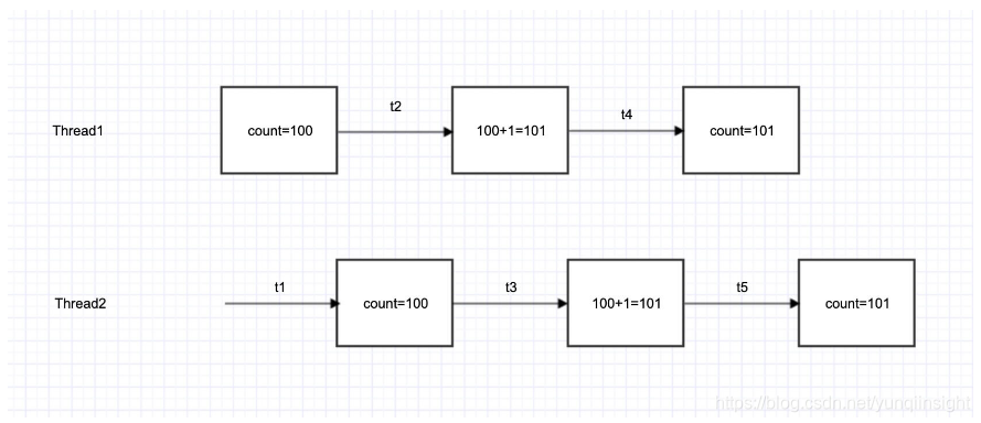 - t5时刻: thread2 将101写入count