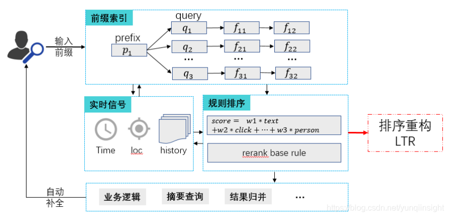 和通用IR系统一样,suggest也分为doc(LBS中的doc即为POI)的召回和排序两个阶段。其中,排序阶段主要使用query和doc的文本相关性,以及doc本身的特征(weight、click),进行加权算分排序。