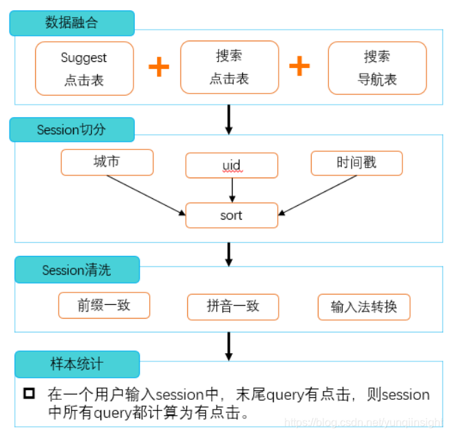 第一步,融合服务端多张日志表,包括搜索建议、搜索、导航等。接着,进行session的切分和清洗。最后,通过把输入session中,末尾query的点击计算到session中所有query上,以此满足实现用户输入session最短的优化目标。