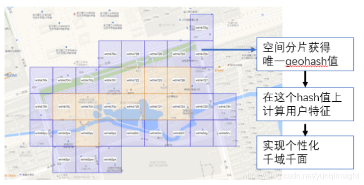 •LBS服务,有很强的区域个性化需求。不同区域用户的需求有很大不同。为实现区域个性化,做到千域千面,首先利用geohash算法对地理空间进行分片,每个分片都得到一串唯一的标识符。从而可以在这个标识符(分片)上分别统计特征。